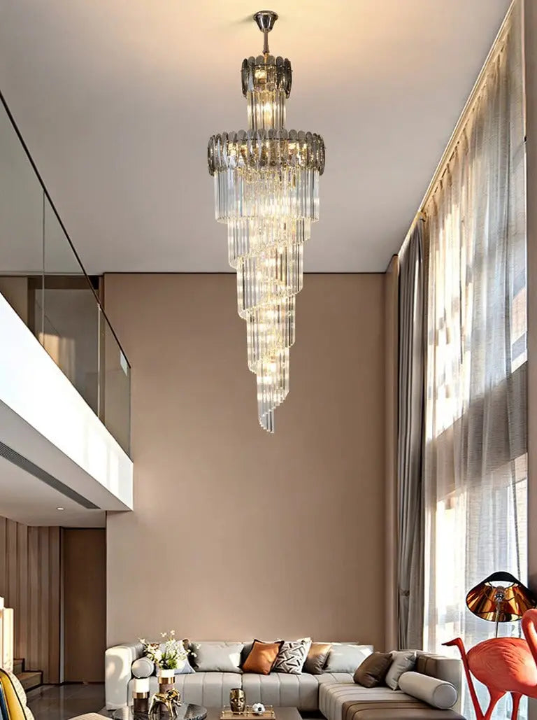Our K9 Crystal Chandelier stands out not only for its exceptional clarity and brilliance, but also for its grand vertical design, perfect for staircase lighting. Designed for spaces with impressive ceiling heights, its cascading structure provides visual depth while maintaining a refined silhouette. Every crystal is precision-cut to maximize light reflection, creating a warm, inviting atmosphere.