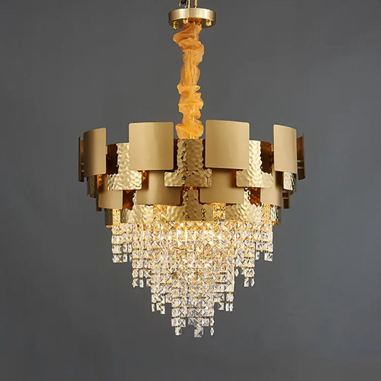 The reflective beauty of a gold chandelier not only elevates your interior design but also creates a warm, ambient glow perfect for any occasion. Gold tones complement a variety of color palettes and décor styles—from modern glam to classic elegance. This Luxury Round Gold Chandelier features a symmetrical circular design with shimmering crystal accents, suspended with precision to offer balance and visual harmony.