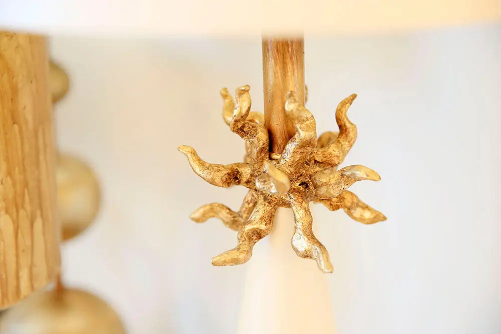 - French White cone base with Gold Leaf anemone element and lamp holder. Topped with a complementing painted cylinder shade.