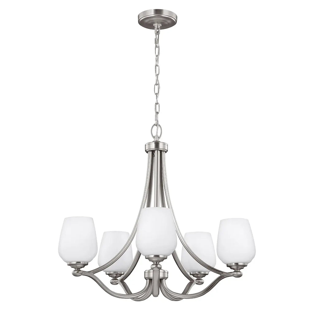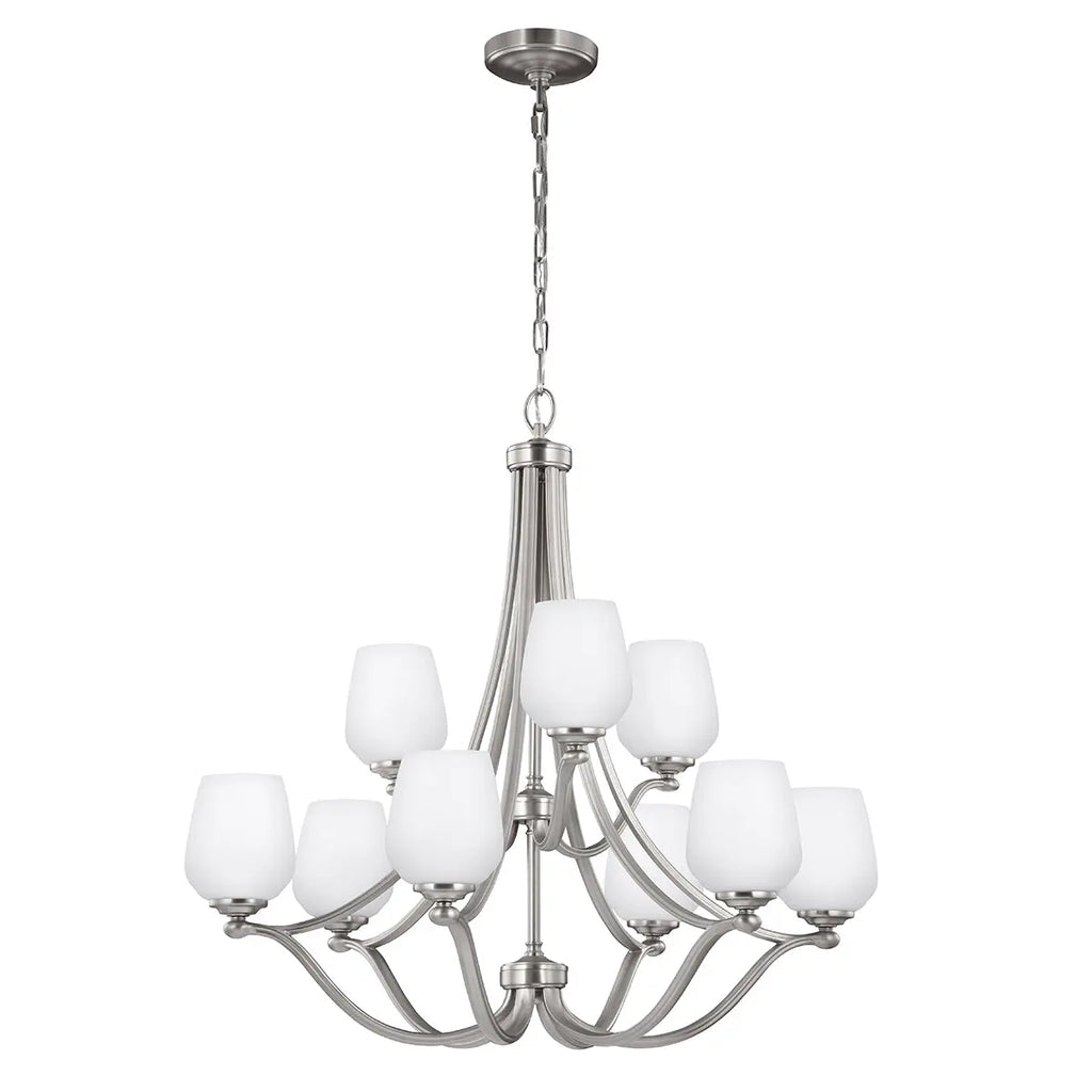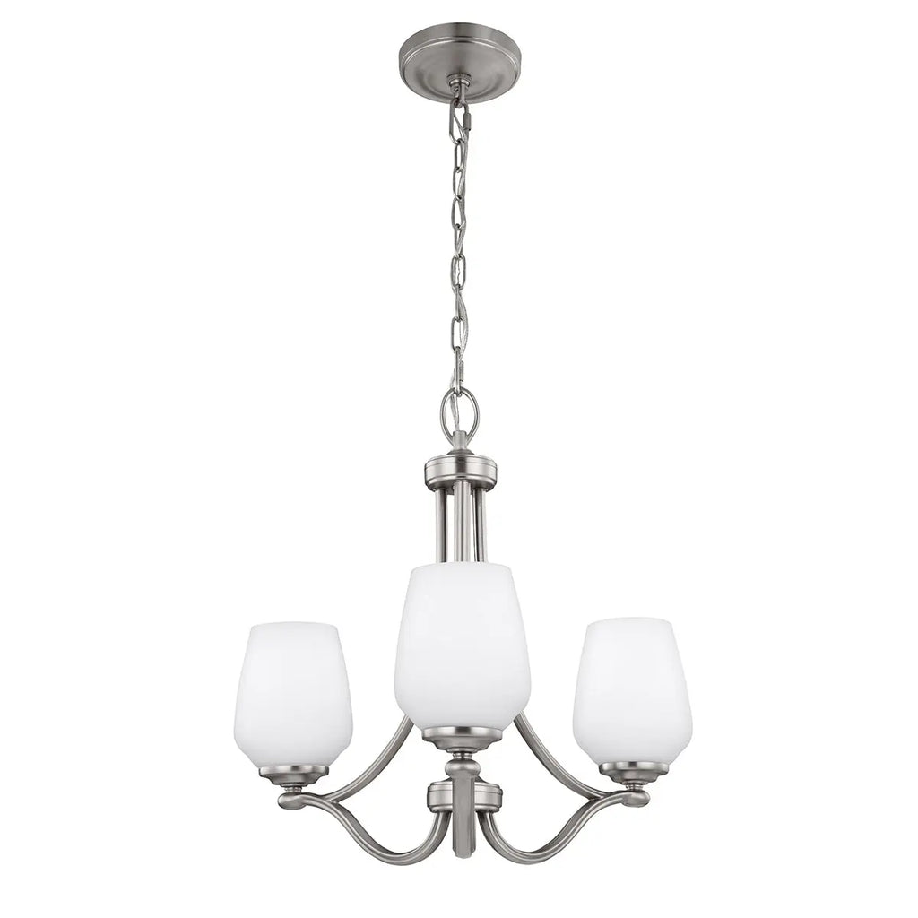 Wine glass-shaped, Opal Etched glass shades inspired the name of the transitional Vintner collection by Feiss. The sweeping design uses smaller arms at the top and slightly larger arms below. A decorative sphere detail acts as a perch for each glass shade for an elegantly simple silhouette in a Satin Nickel finish.