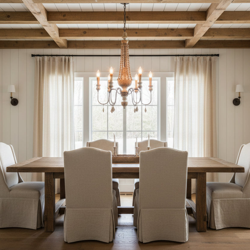 Position your farmhouse chandelier above a reclaimed wood dining table for maximum impact. Use warm white bulbs (2700K–3000K) for cozy ambiance. For larger rooms, choose a proportional diameter to maintain visual balance.